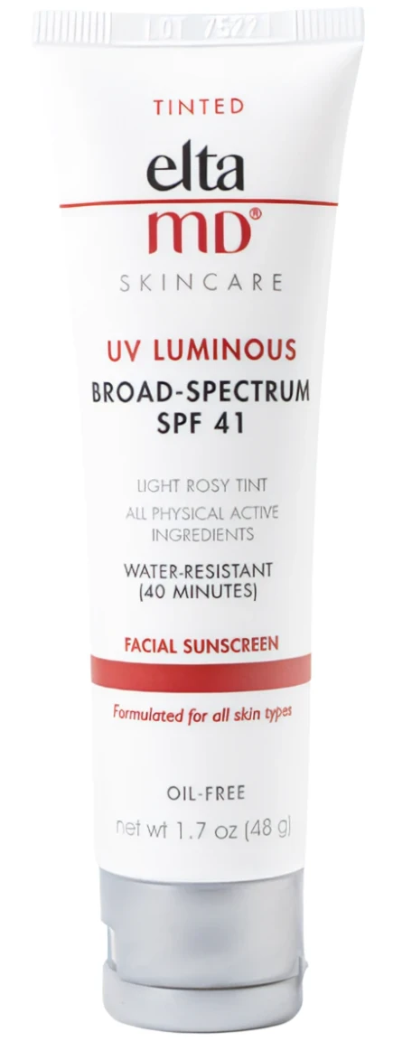 EltaMD UV Luminous Broad Spectrum SPF 41 sunscreen is ideal for those looking for non-greasy UV protection with all physical active ingredients. This sunscreen is gentle and lightly tinted. It provides excellent protection against UVA (aging) and UVB (burning) rays. It applies quickly to the face, absorbs quickly and can be used alone or worn under makeup.