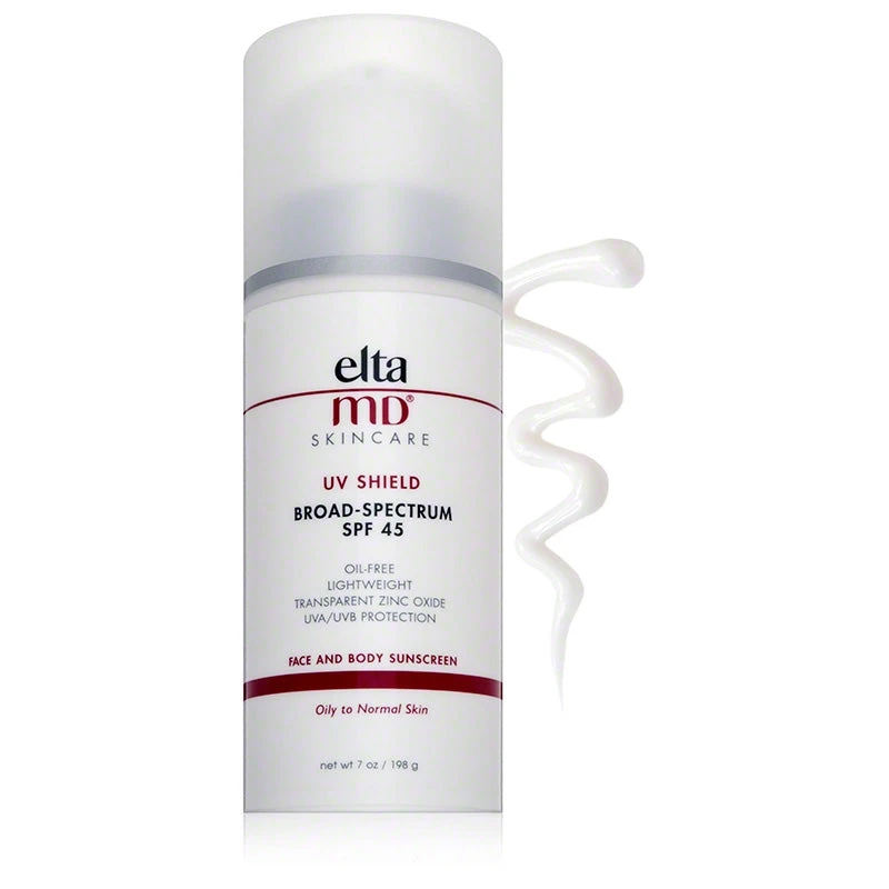 EltaMD UV Shield Broad-Spectrum SPF 45 shields your skin from the damaging effects of sun exposure. Packed with micronized zinc oxide and rich antioxidants to protect against harmful UVA and UVB rays. Its sheer, lightweight formula makes a great base for makeup or may be worn alone.