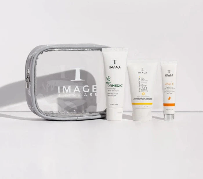 Includes: ORMEDIC balancing facial cleanser (1.7 oz), VITAL C hydrating anti-aging serum (0.5 oz), and PREVENTION daily matte moisturizer SPF 30 (1.5 oz). Also includes bonus cosmetic bag.